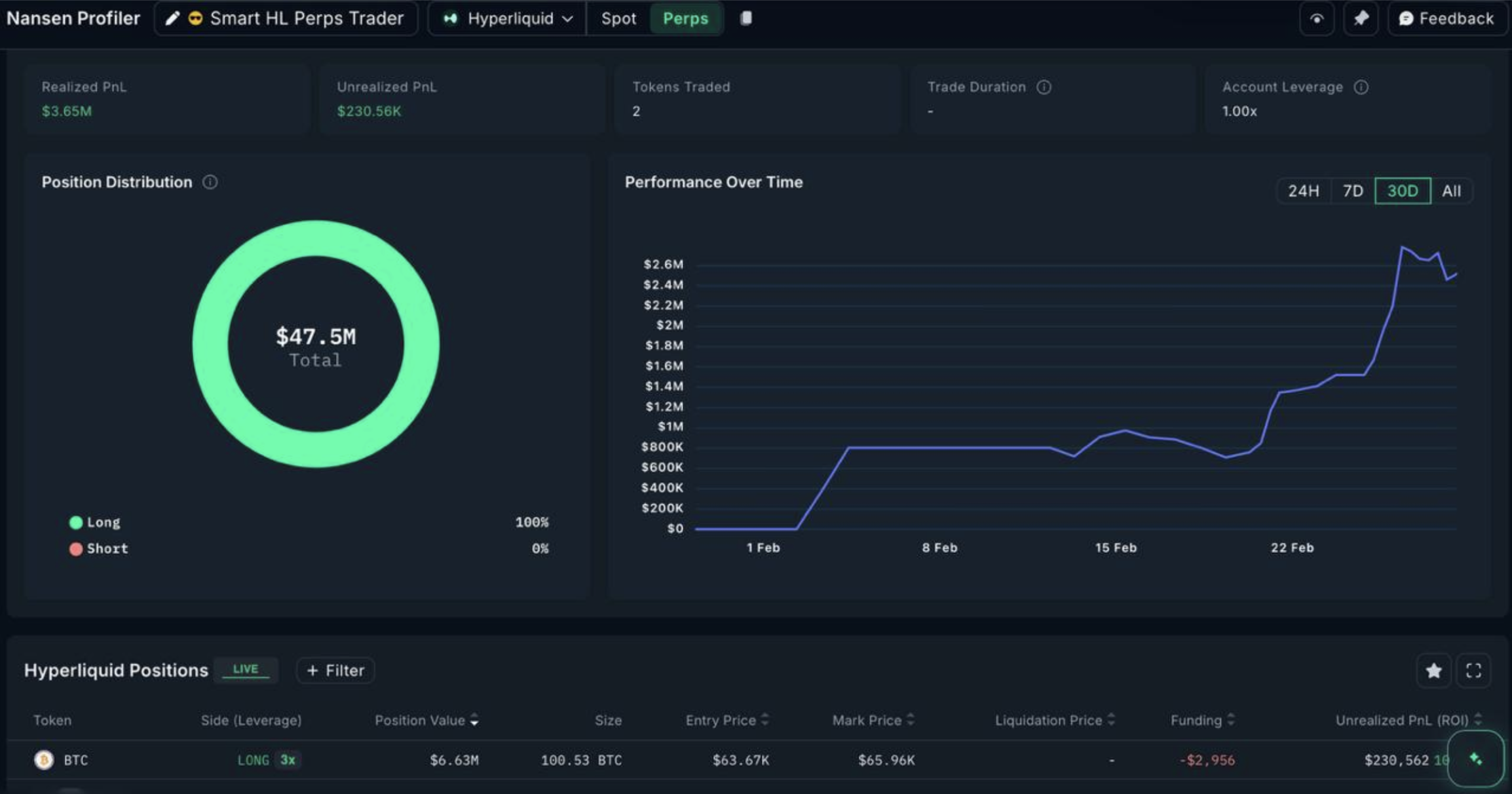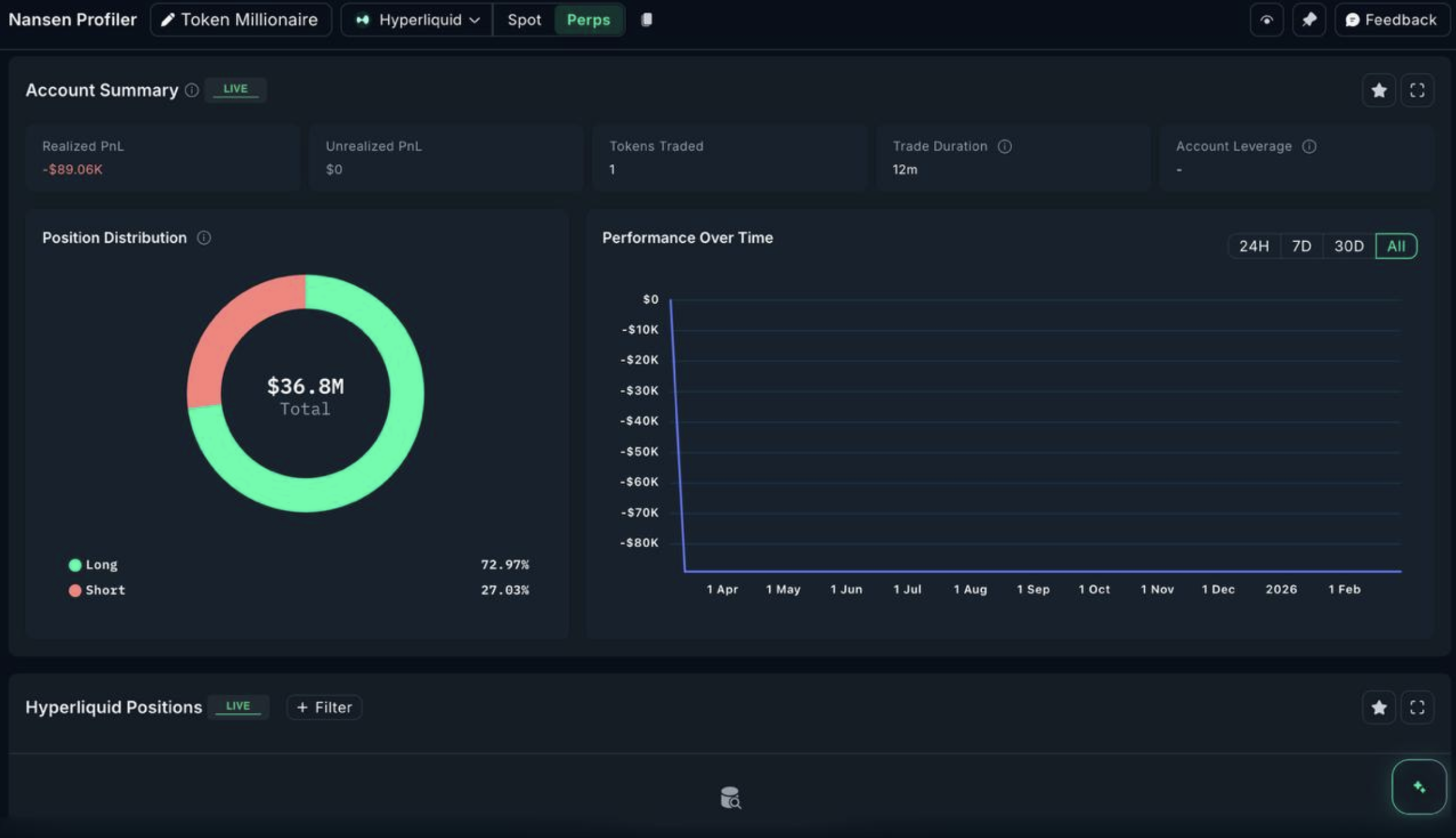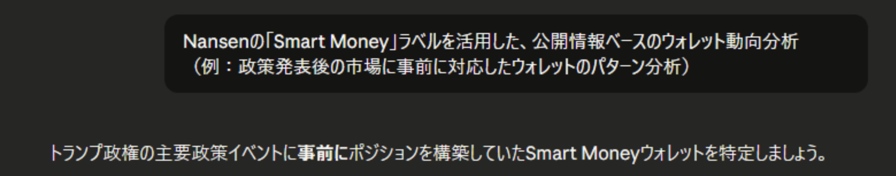 昨今、ウォレットにラベリングを行うオンチェーン分析ツールが高度化しており、ポジション情報サイト「Nansen」にAIアプリ「Claude」をAPI接続することで、勝率の高いトレーダーのポジションデータを効率的に検索することが可能になっている。